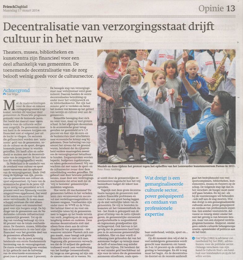 'Decentralisatie van verzorgingsstaat drijft cultuur in het nauw'. Opinie-bijdrage in het Friesch Dagblad, 17 maart 2014.